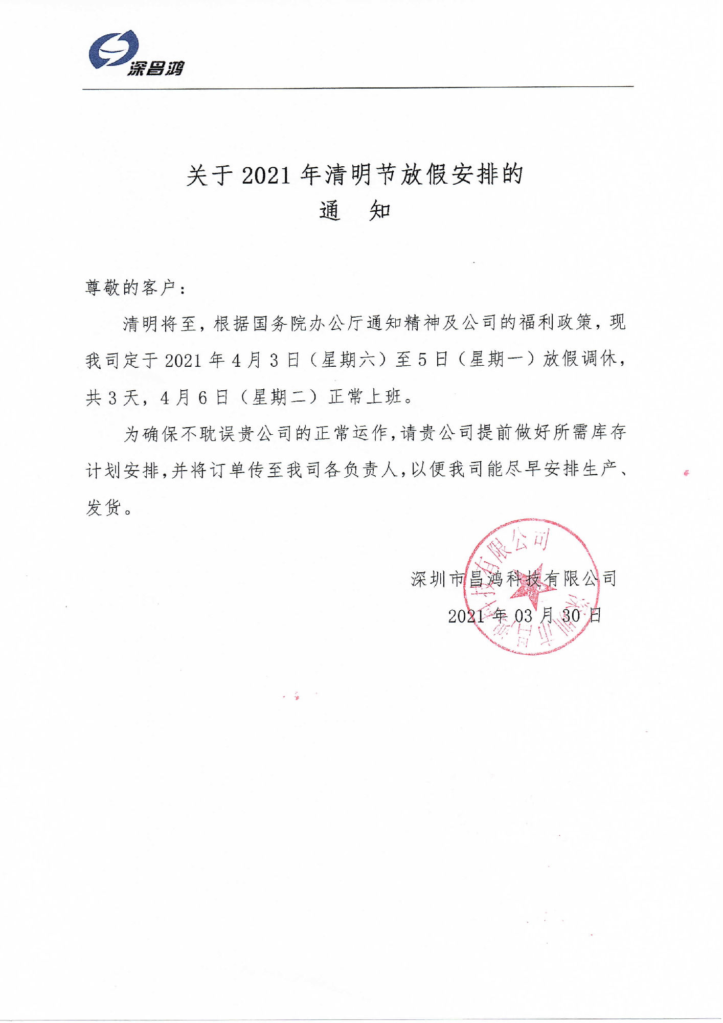 清明將至,根據(jù)國務(wù)院辦公廳通知精神及公司的福利政策,現(xiàn)我司定于2021年4月3日(星期六)至5日(星期一)放假調(diào)休,共3天,4月6日(星期二)正常上班。