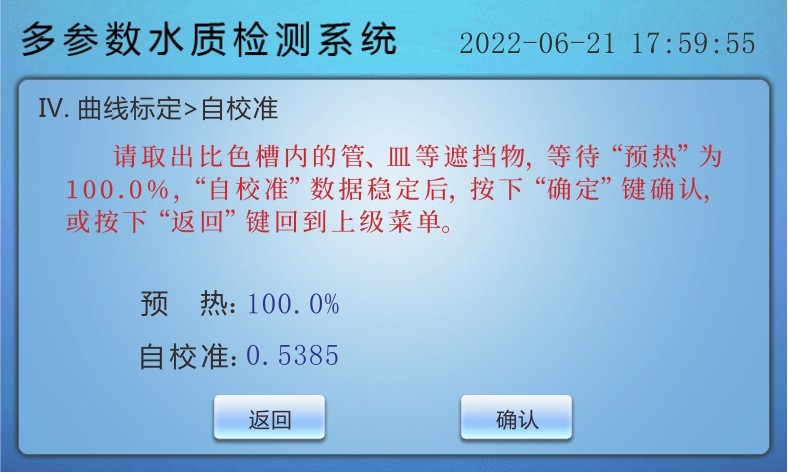 在曲線標(biāo)定子菜單中點(diǎn)擊“自校準(zhǔn)”,儀器進(jìn)入自校準(zhǔn)界面,標(biāo)定時(shí)的自校準(zhǔn)是為了得到一個(gè)自校準(zhǔn)的參考值,主要是為了以后測量空白時(shí)的自校準(zhǔn)和該值對比使用。根據(jù)“系統(tǒng)設(shè)置-其它設(shè)置”中預(yù)熱時(shí)間的值,來保證從該光學(xué)通道工作的時(shí)間值,當(dāng)預(yù)熱值達(dá)到100.0%時(shí),系統(tǒng)得到一個(gè)信號值,當(dāng)該值穩(wěn)定后,點(diǎn)擊“確認(rèn)”即可。